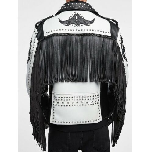 Handmade Men Two Tone Biker Studded White Leather Jacket, Motorcycle Jacket