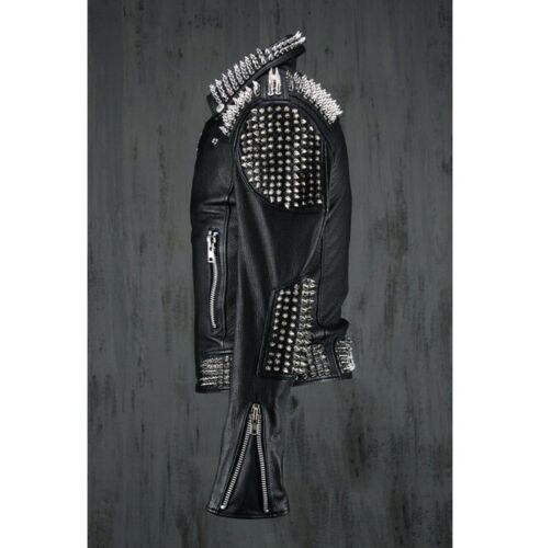 Handmade Men Black Punk Silver Long Spiked Studded Leather Jacket