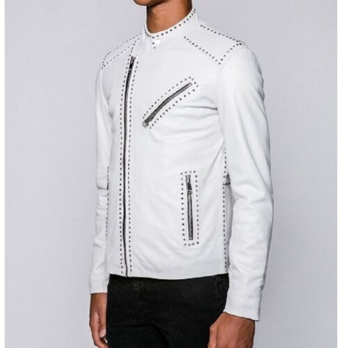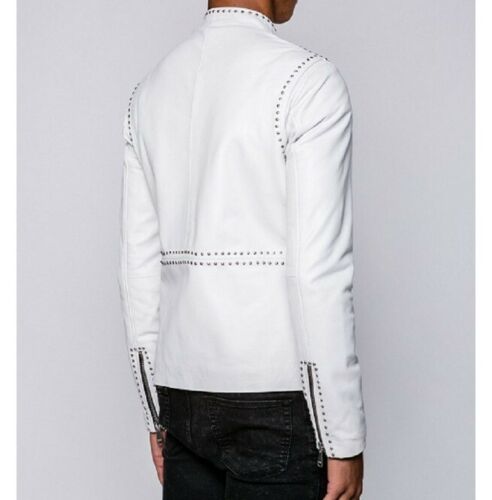 Men Slim Fit Studded White Leather Jacket, Rock Motorcycle Jacket