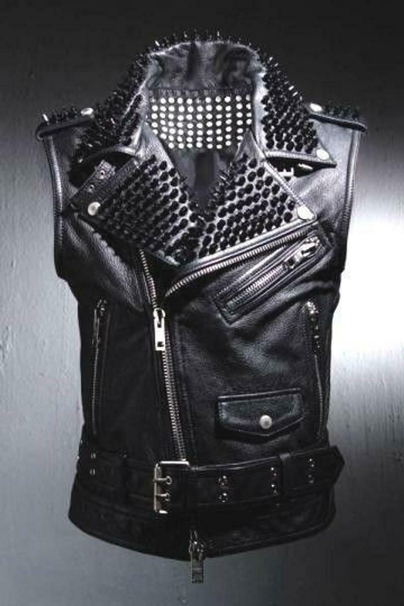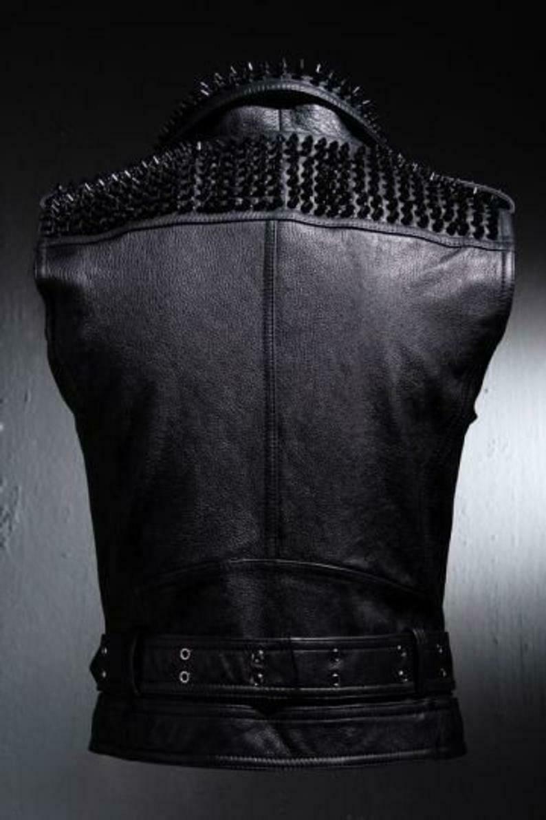 Black Leather VEST Black Stud HANDMADE Men Black Punk Silver Long Spiked Studded