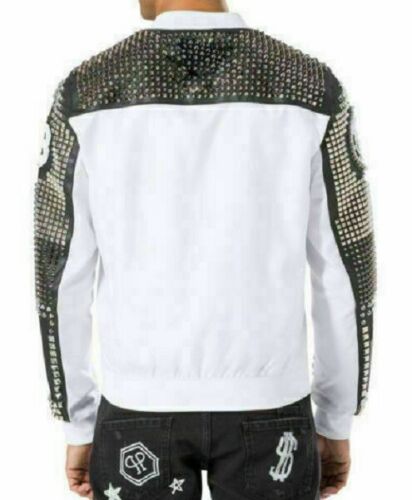 Men's White Black Silver Studded Embroidery Patches Leather Coat