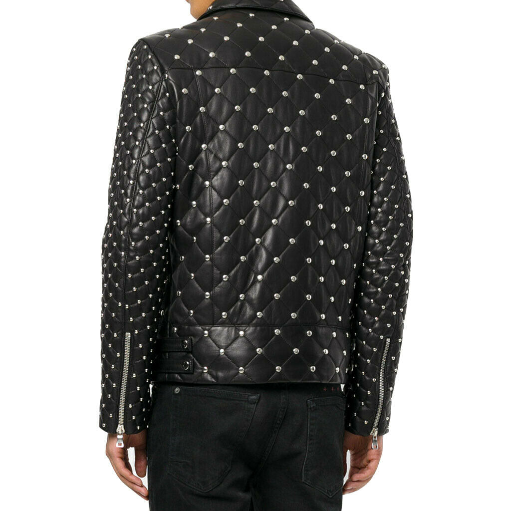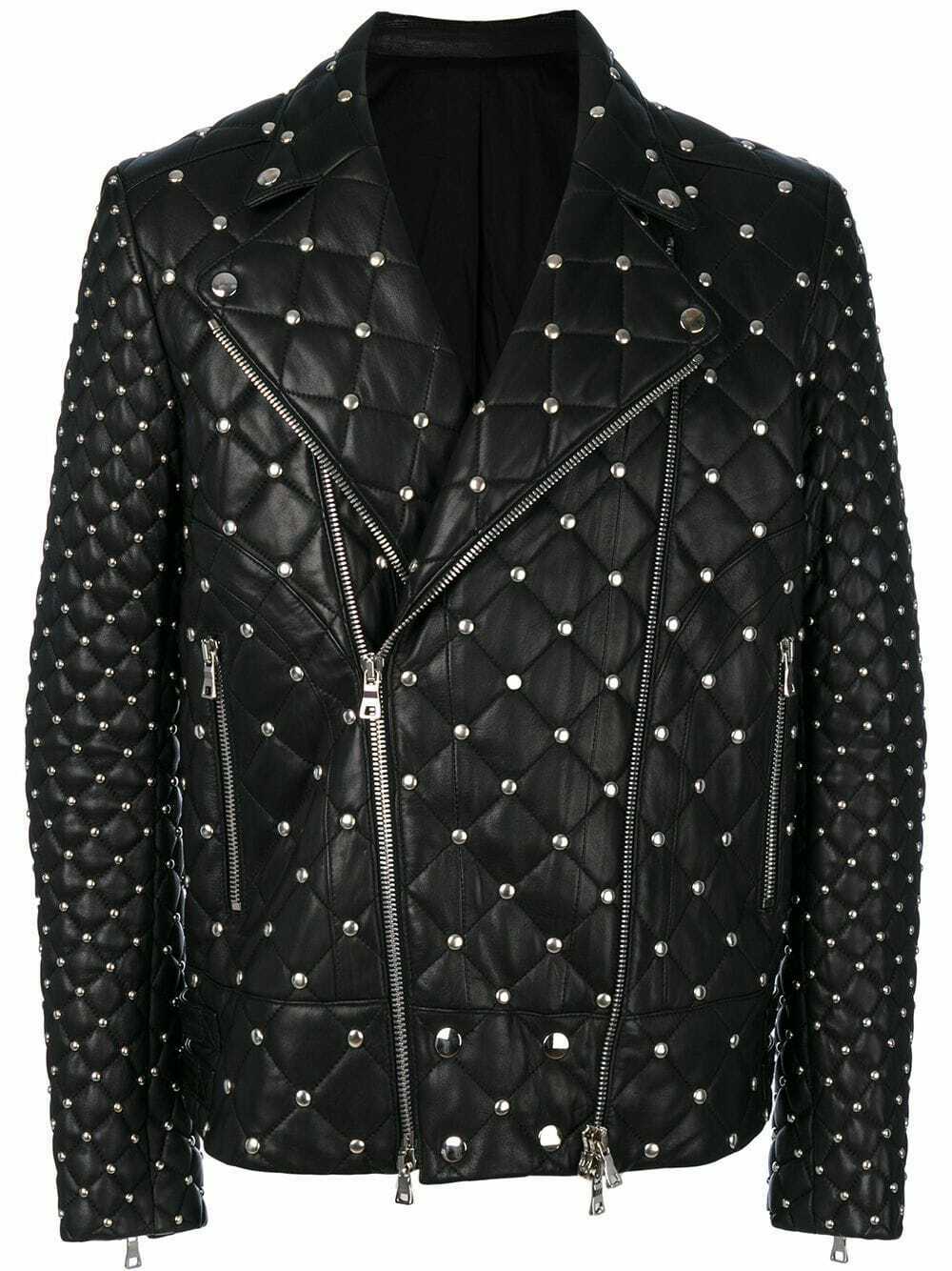 Mens Balmain Brando Style Full Silver Studded Quilted Zippered Leather Jacket