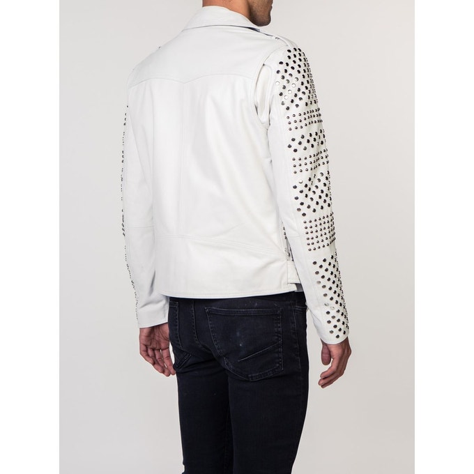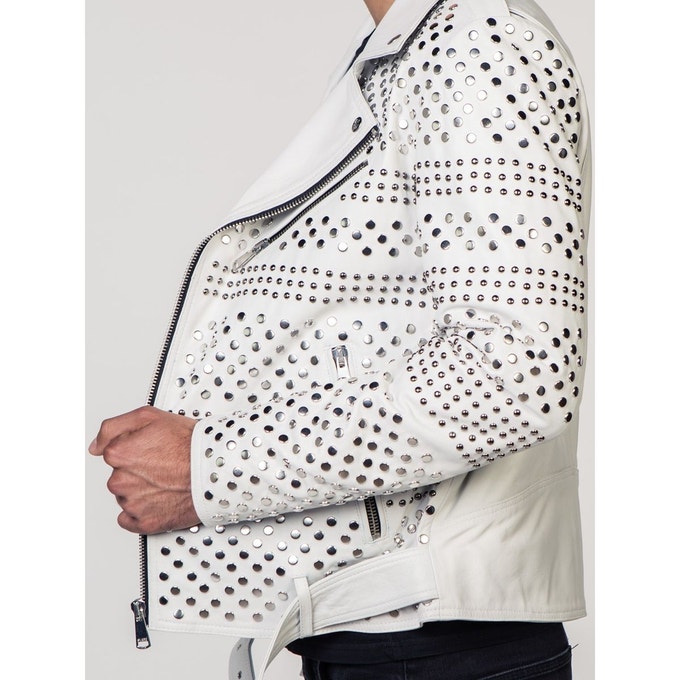 Handmade Mens Punk Style White Sliver Studded Brando Biker Leather Jacket