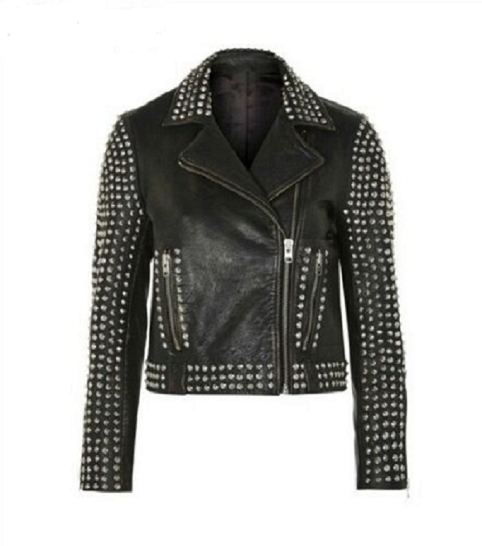 New Woman Punk Black Silver Studded Brando Style Cowhide Biker Leather Jacket
