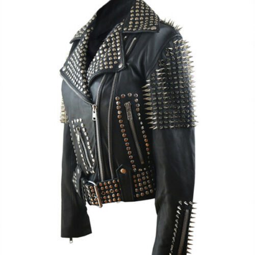 New Woman Black Punk Silver Spiked Studded Cowhide Brando Belted Leather Jacket