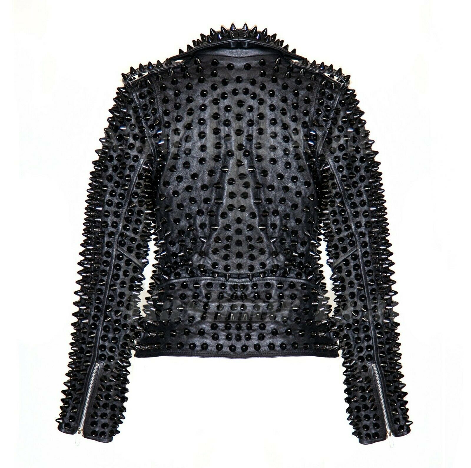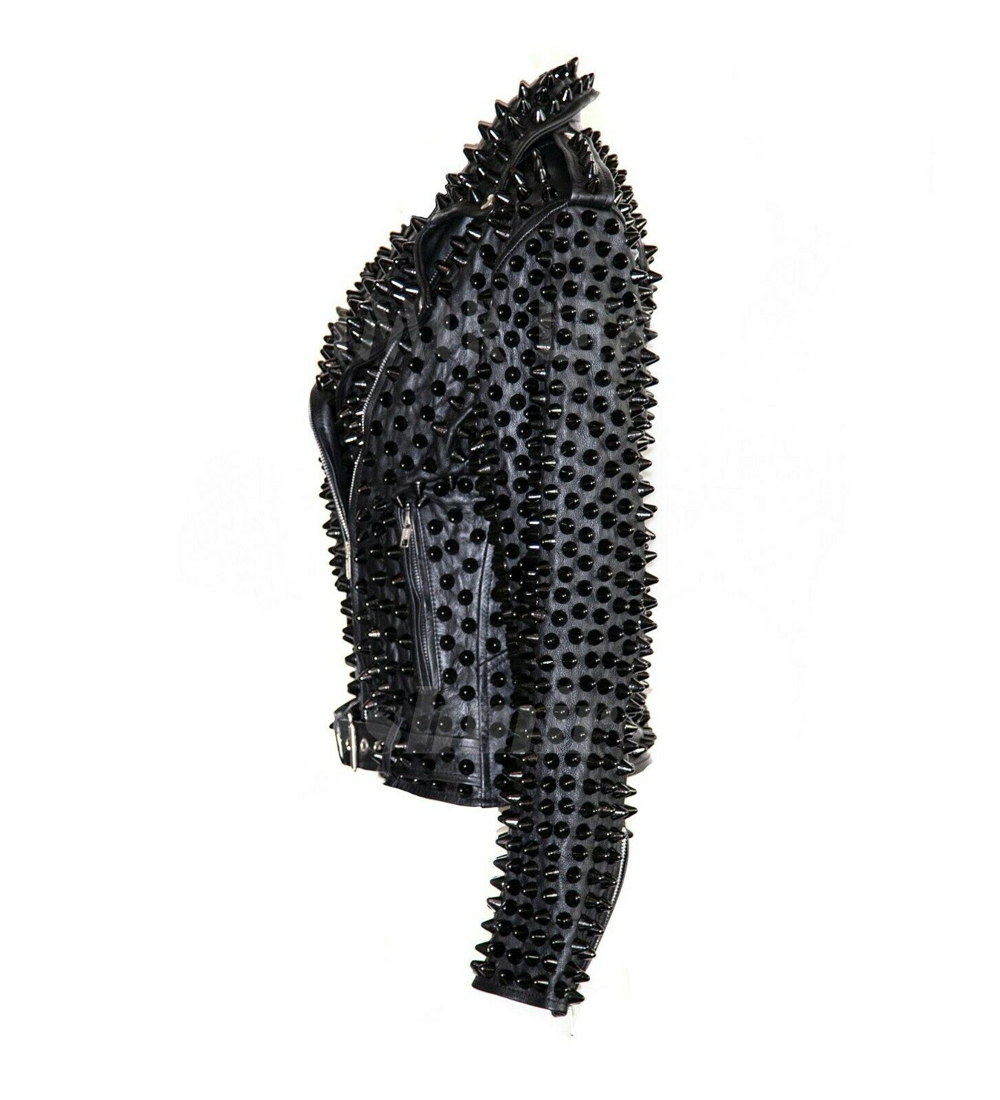 New Woman Rock Punk Full Black Tonal Spiked Studded Brando Biker Leather Jacket