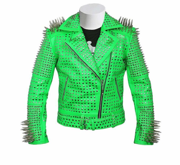 Men Green Punk Full Long Spike Studded Brando Waist Belted Cow Leather Jacket
