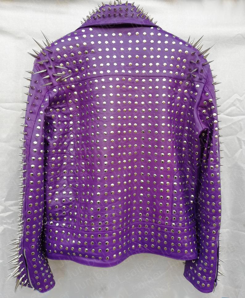 New Men's Full Purple Steam Punk Silver Long Spiked Studded Leather Brando Jacket Rock Style