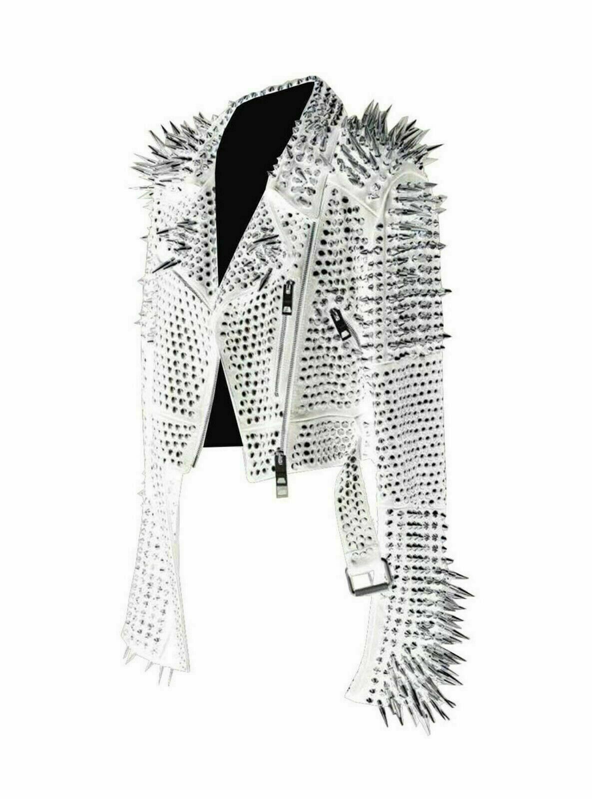 Men's White Punk Full Silver Long Spiked Studded Brando Bike Leather Jacket