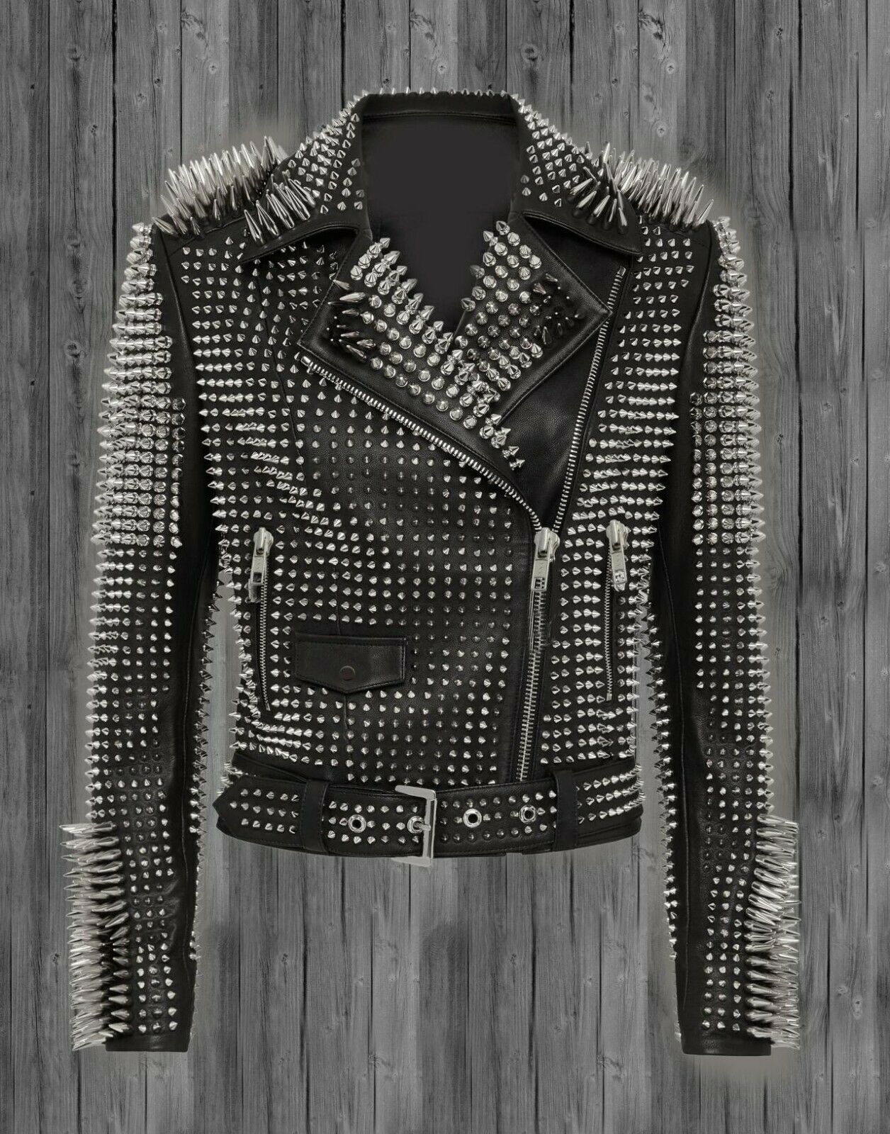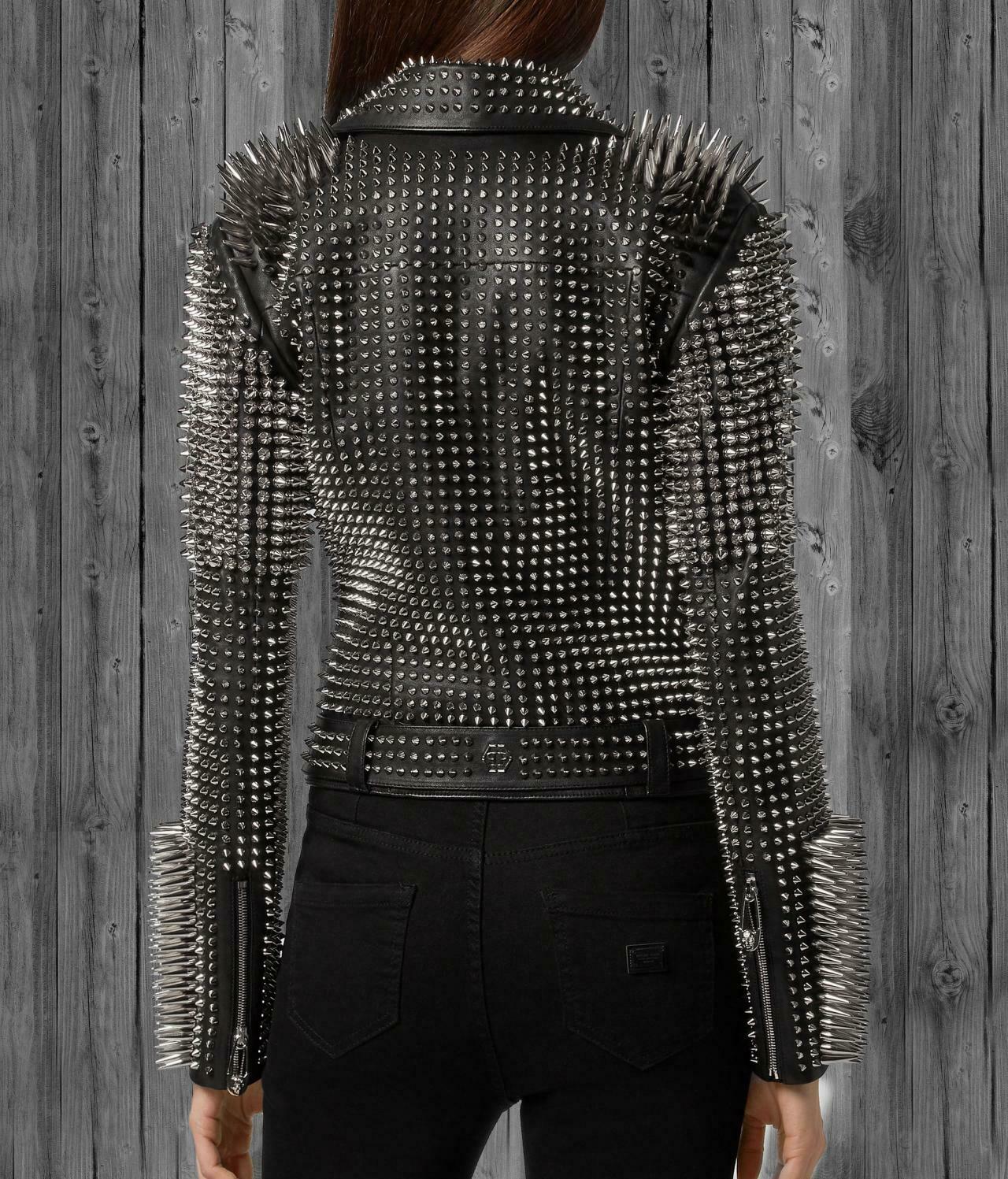 Women Perfect Wear Heavy Metal Silver Punk Spike Studded Real Leather Jacket