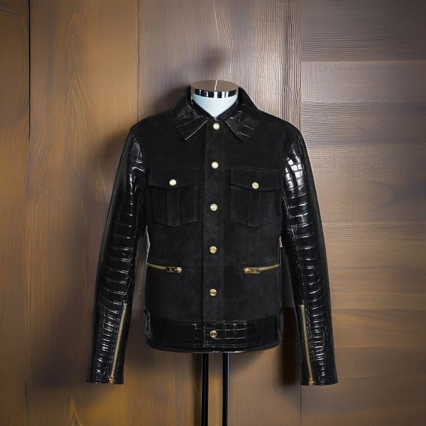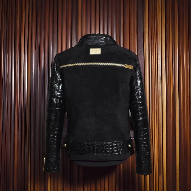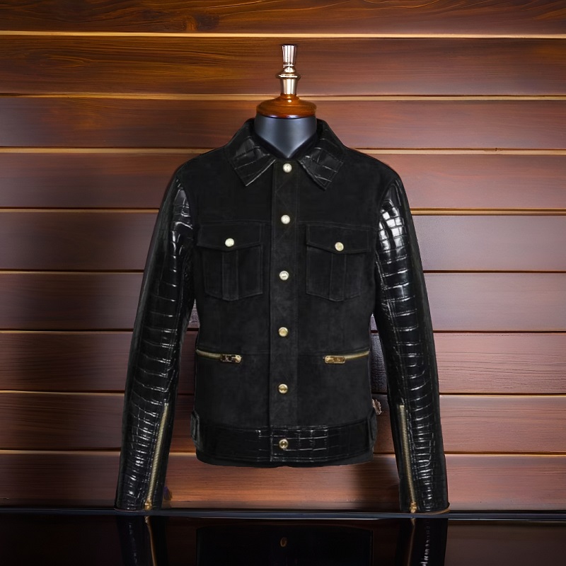 Hand Stitched Black Suede & Crocodile Leather Winter's Fashion Slim Fit Biker Leather Jacket Men Style