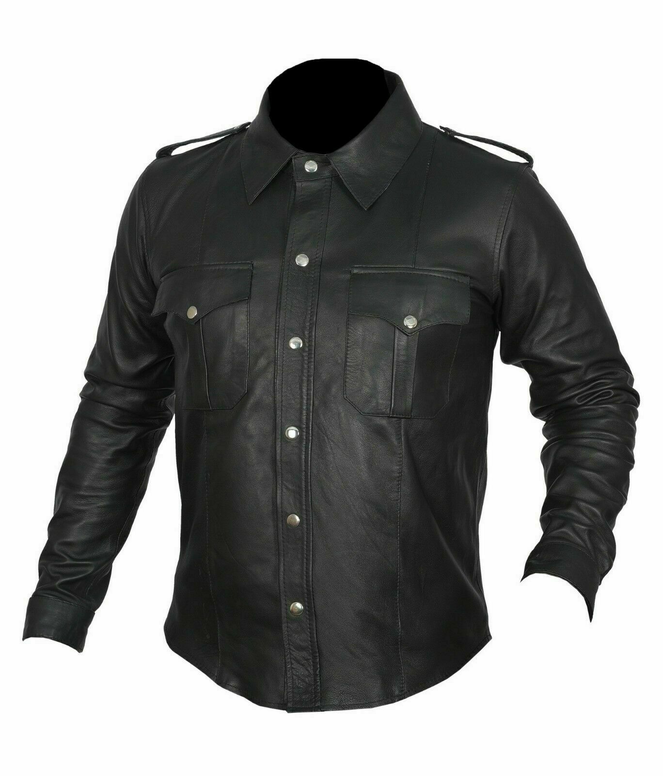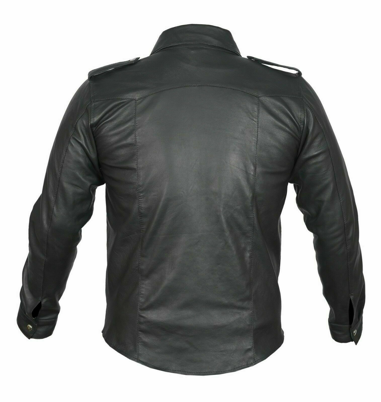 MEN POLICE MILITARY STYLE SHIRT BLACK REAL LEATHER FULL SLEEVES