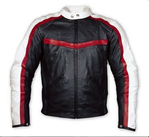 Men Black White Motor Biker Red Strip Genuine Cowhide Leather Safety Pads Jacket