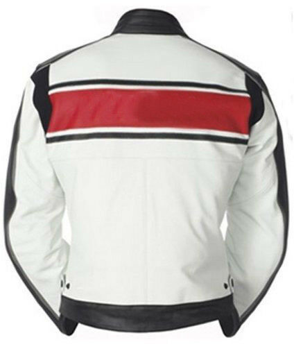Men Black & White Contrast Biker Red Stripped Genuine Leather Safety Pads Jacket