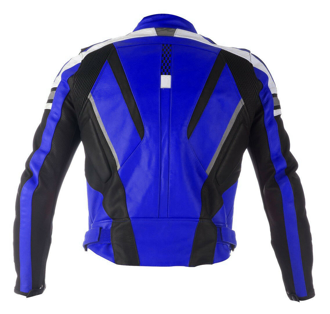 Men Black Blue Contrast White Stripes Biker Genuine Leather Safety Pads Jacket