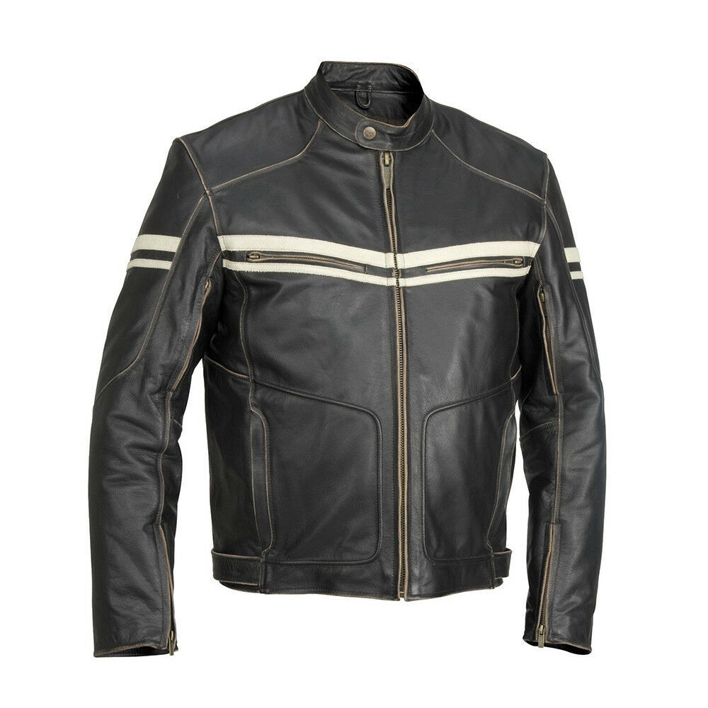 Men Black Motor Biker White Stripes Genuine Cowhide Leather Safety Pads Jacket