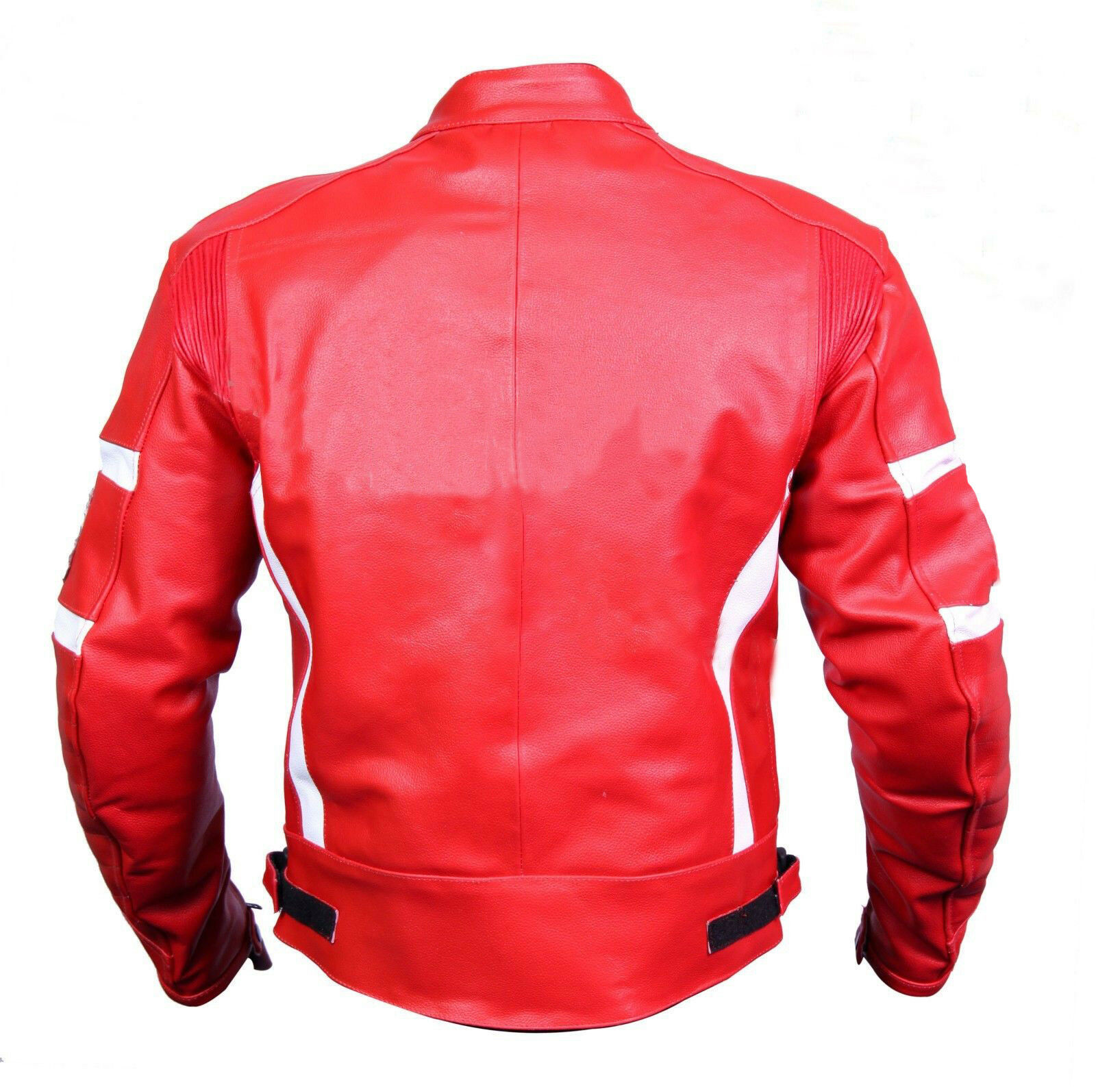 Hand Made Red Motor Cycle White Stripes Genuine Real Leather Safety Pads Jacket
