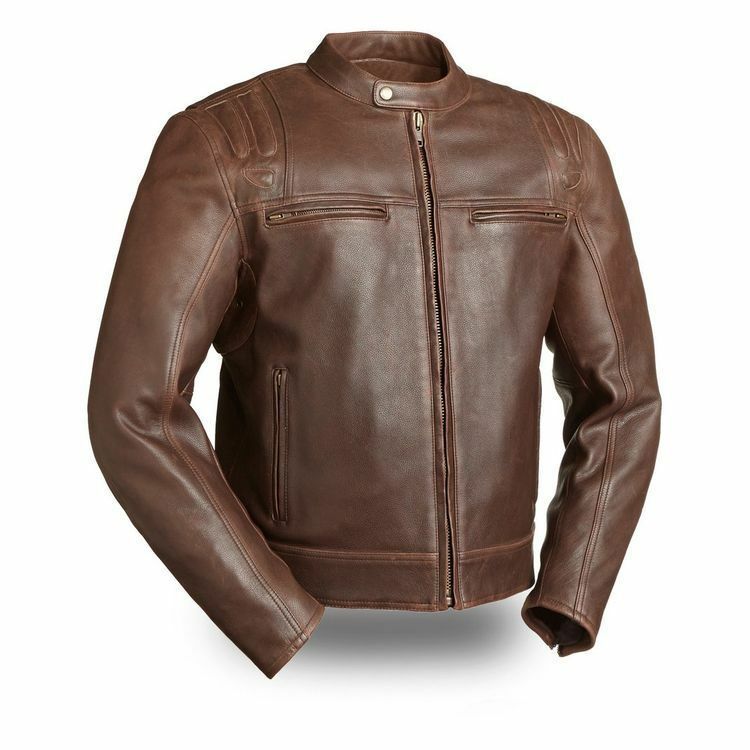 Hand Made Men Brown Motorcycle Front Zipper Genuine Leather Safety Pads jacket