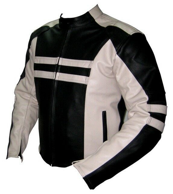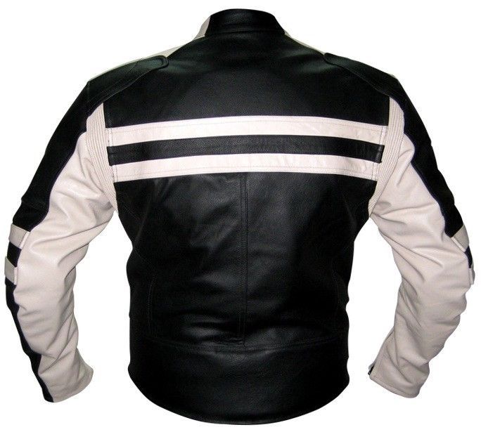Customize Men Black White Contrast Motor Biker Genuine Leather Safety Pad Jacket