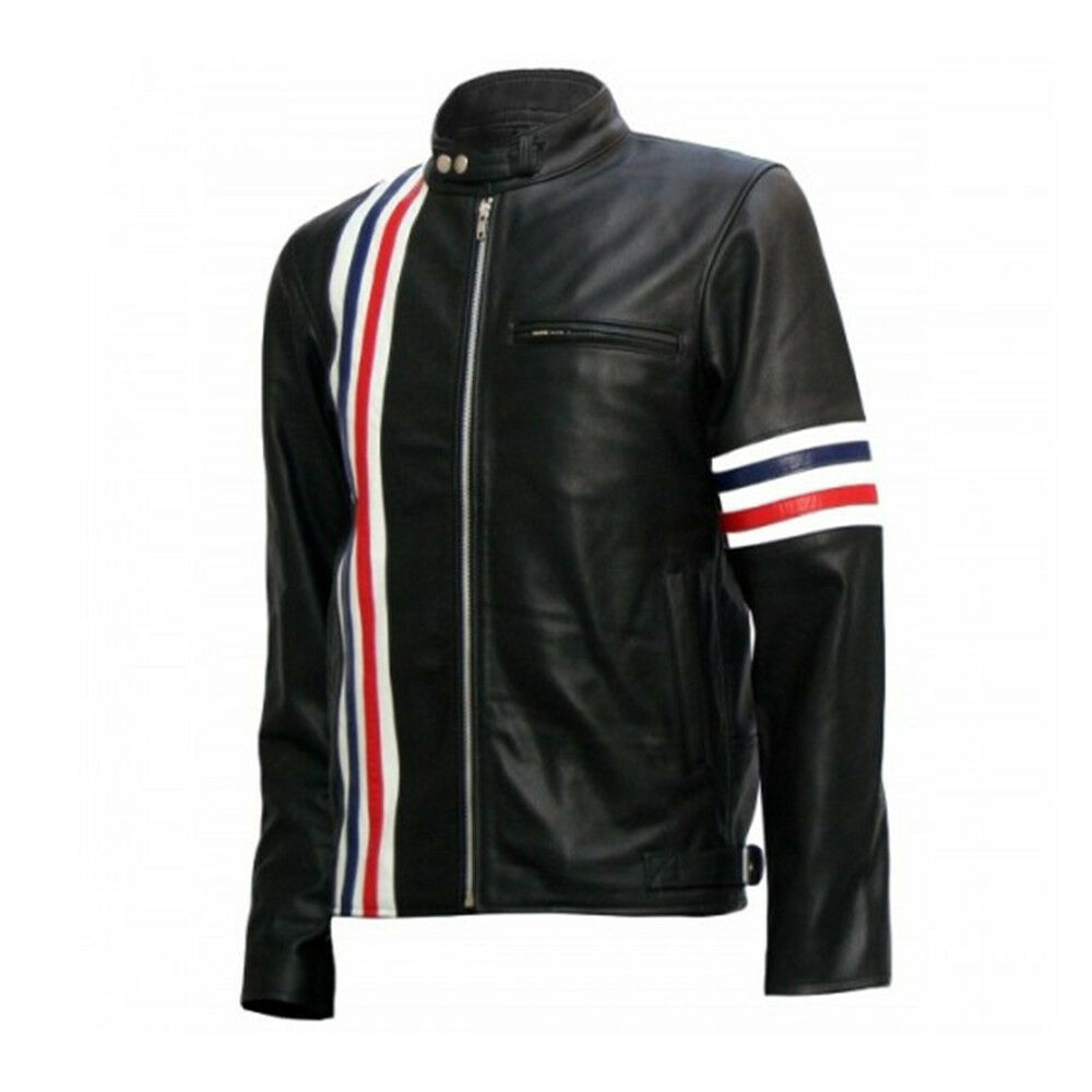 Custom Men Black Color Motorcycle Red Blue White Striped Genuine Leather Jacket