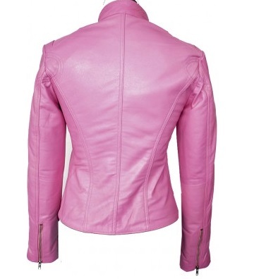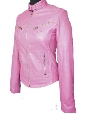 Women Pink Fashionable Leather Jacket With Tab Collar Front Zipper Hand Stitched