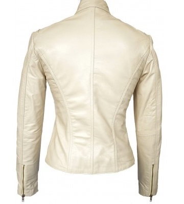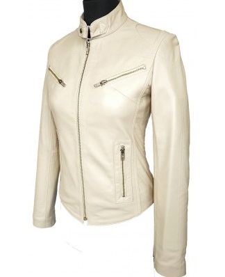 White Fashionable Women Leather Jacket With Tab Collar Front Zipper Handmade