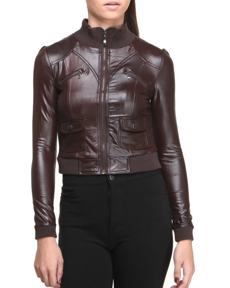 Women Brown Biker Real Jacket Leather Rib Collar Stretchable Waist and Sleeves