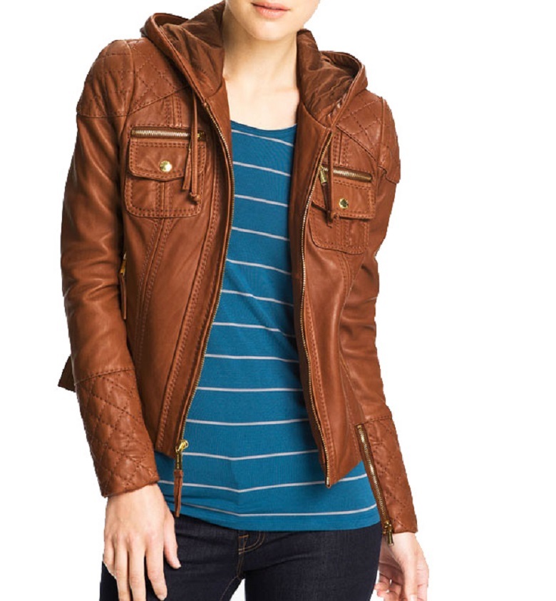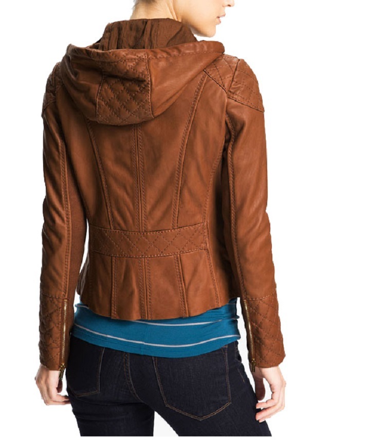 Luxury Brown Women Jacket Quilted Biker With Pockets Zipper Leather Hoody