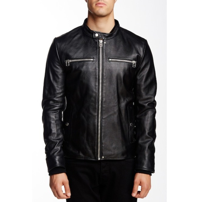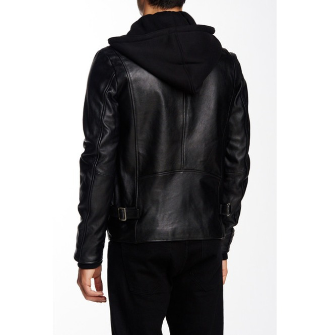 Men Black Detachable Fabric Hooded Leather Jacket Motorcycle Leather Jacket