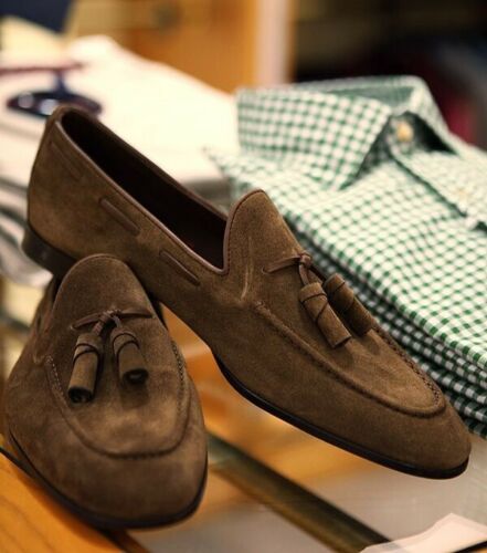 New Handmade Pure Brown Suede Leather Stylish Tassels Loafer Shoes for Men's