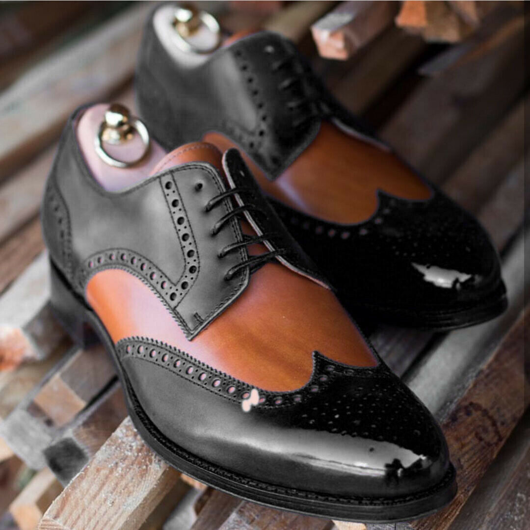 Men’s Handmade Black & Tan Brown Color Leather Shoes, Wing Tip Brogue Dress