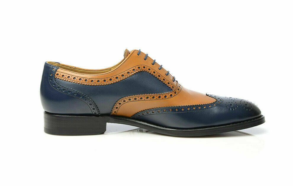 Two Tone Tan Blue Contrast Oxford Brogue Toe Wing Tip Real Leather Lace up Shoes