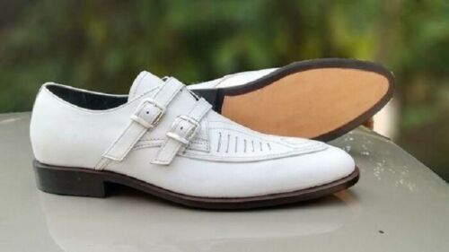 New Handmade Men’s Leather Double Monk Shoes, Men’s White Color Strap Stylish