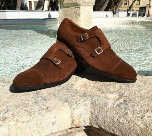 Handmade Men’s Dark Brown Color Suede Leather Shoes, Double Monk Strap Cap Toe