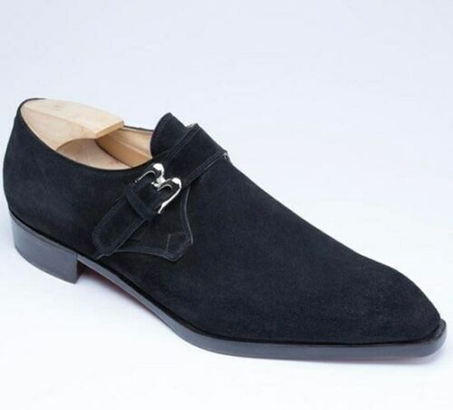 Handmade Men,s Navy Blue Suede Monk Strap Shoes