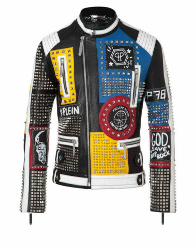 Men's Handmade Jackets Fashion Silver Stud Earrings Multicolor Motorcycle Cowhide