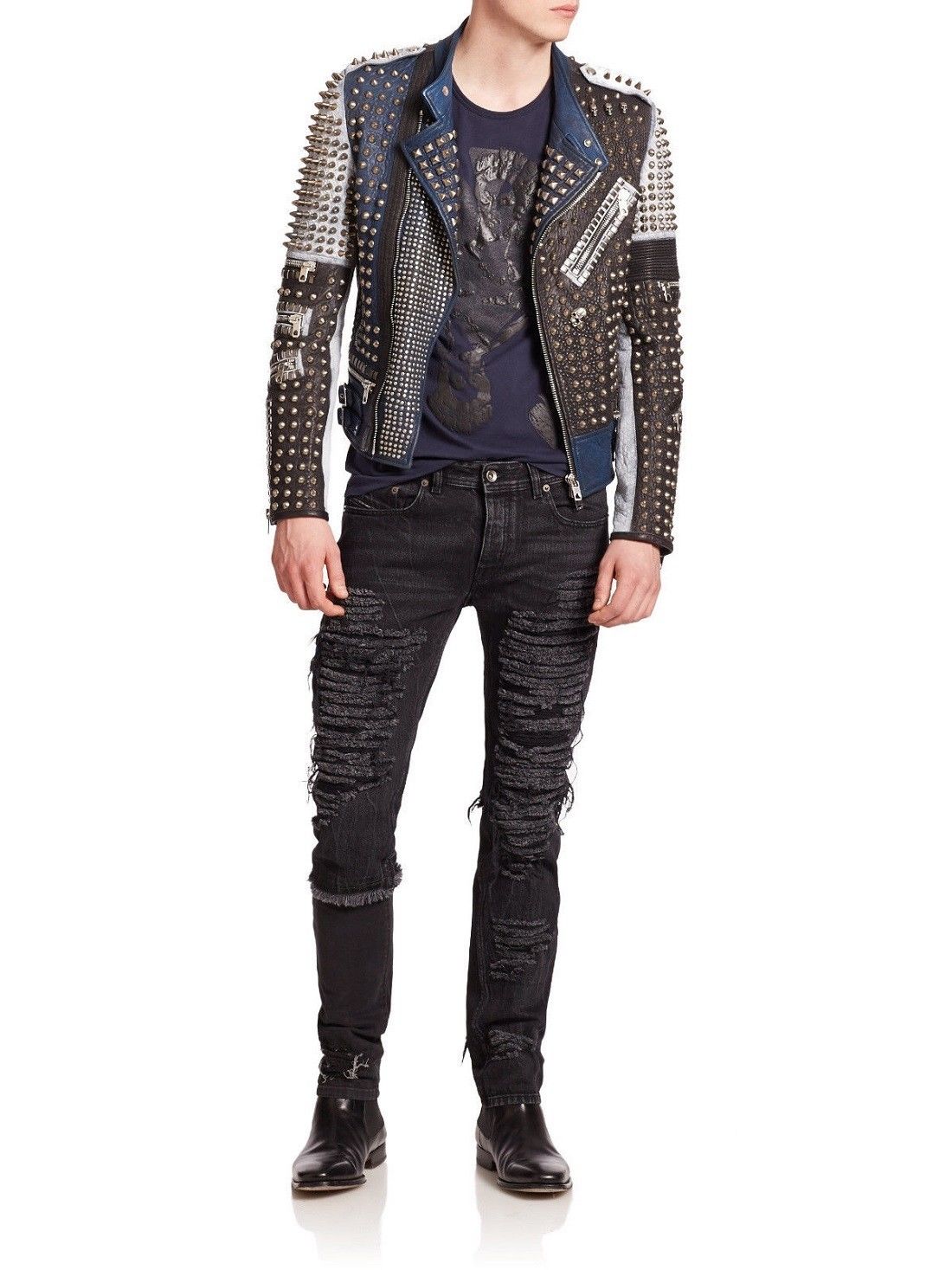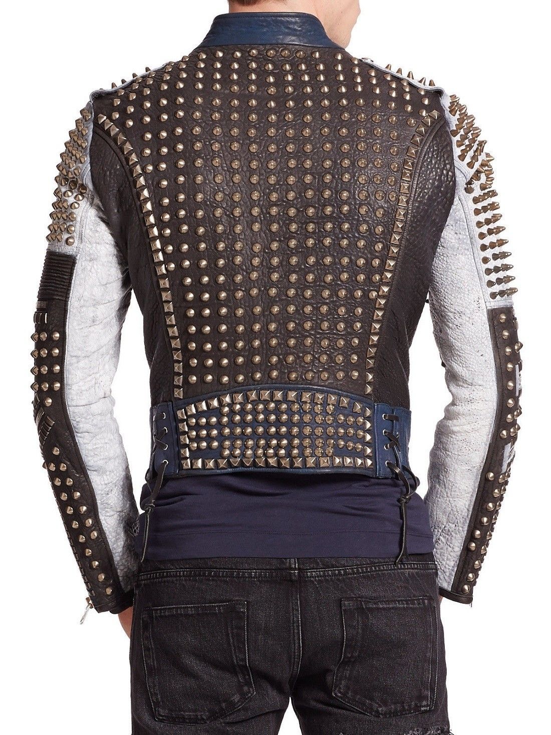 New Handmade Men Golden Studded Multi Color Leather Jacket Men Style Silver Stud