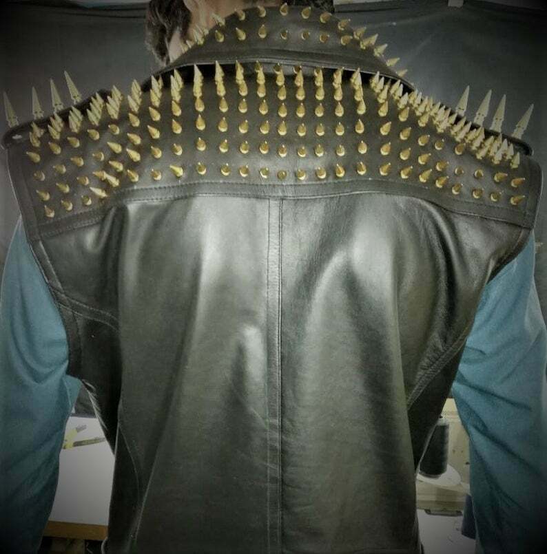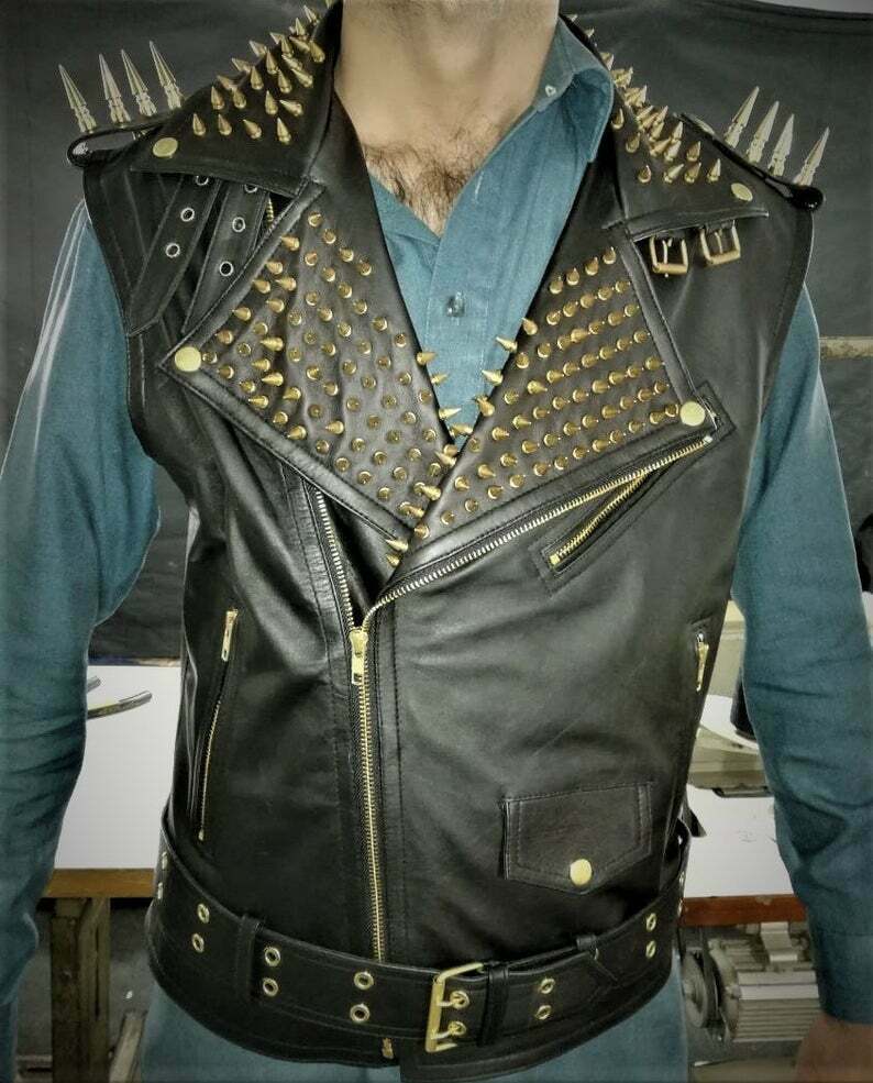 Gold Studded VEST JACKET HANDMADE Men Black Punk Silver Long Spiked Studded