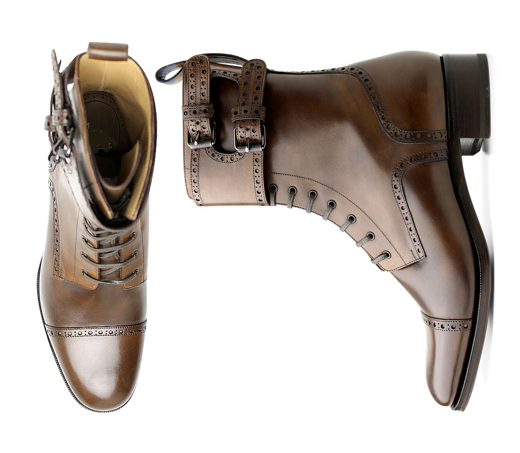 Handmade Brown Men's Lace Up With Double Monk Straps Ankle Leather Boot