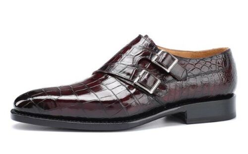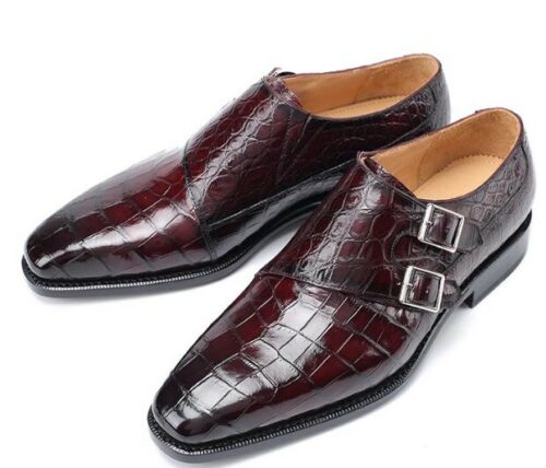 Handmade Men's Double Monk Strap Crocodile Texture Leather Dress Shoes