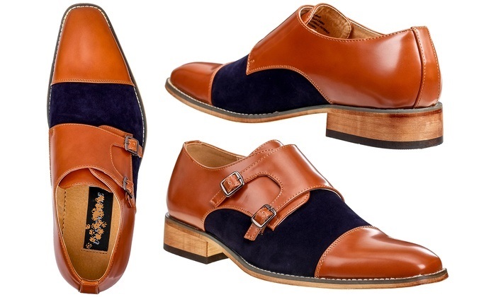Men Tan Monk Double Buckle Strap Handmade Navy Blue Suede Genuine Leather Shoes