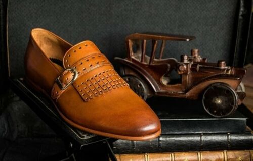 Handmade Men Tan Brogue Fringes Monk Strap Dress Shoes, Real Leather Shoes