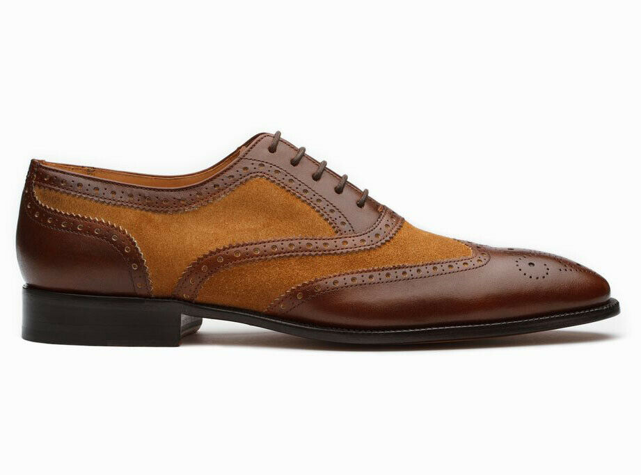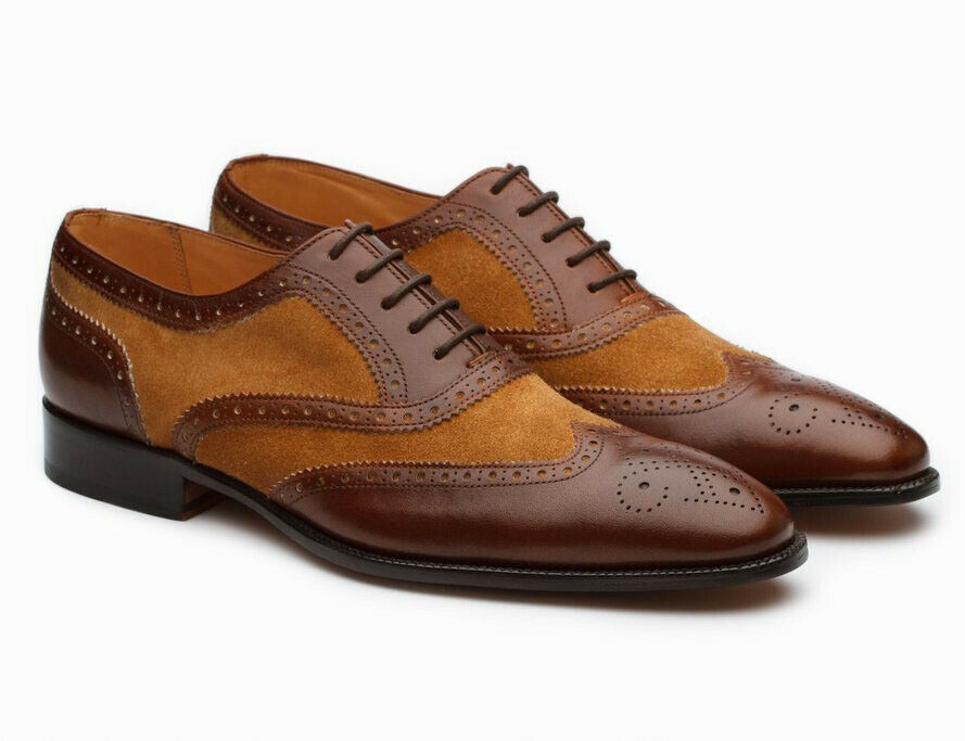 Mens Handmade Shoes Wing Tip Spectator Two Tone Leather Suede Lace Up Brogue New