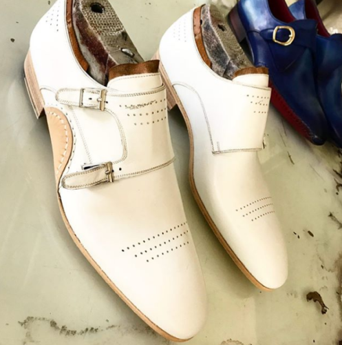 Handmade Men's White Brogue Double Monk Strap Dress Leather Shoes