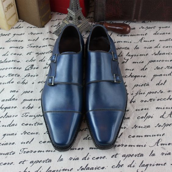 Genuine Leather Monk Strap Men's Formal Business Shoes In Catalina Blue Color