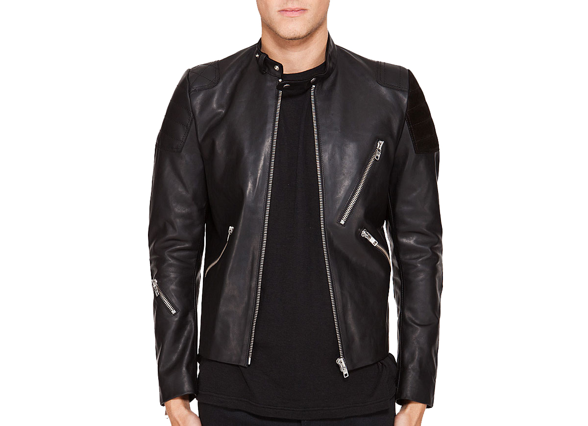 Men's Black Leather Biker Jacket With Tab Collar and Front Fastening Zipper