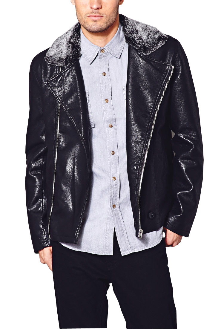 Blue Leather Jacket With Fur Collar Front Buttons Zip Closure Men's Fashionable