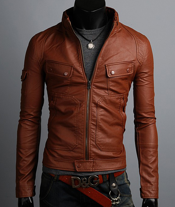 Luxury Men Jacket Brown Leather Belted Tab Collar Two Pockets and Front Zipper