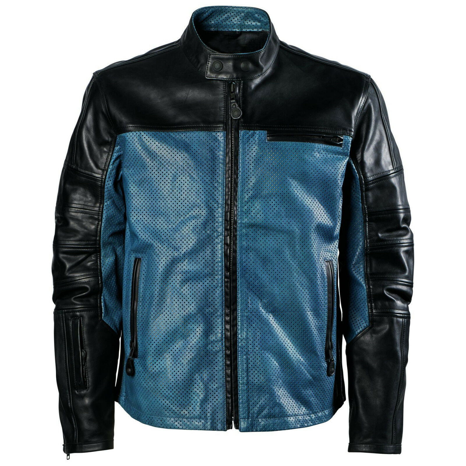Perforated Men Black Blue Cont Motor Bike Genuine Leather Safety Pads jacket