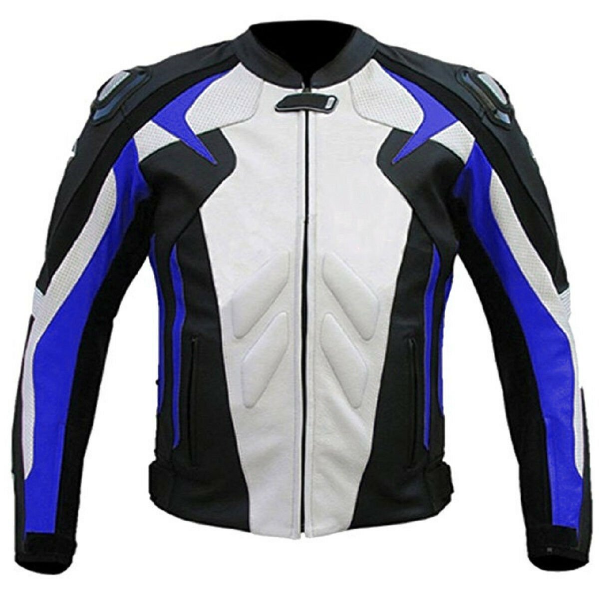 Three Tone Color Men Black White Blue Motorcycle Real Leather Safety Pads jacket